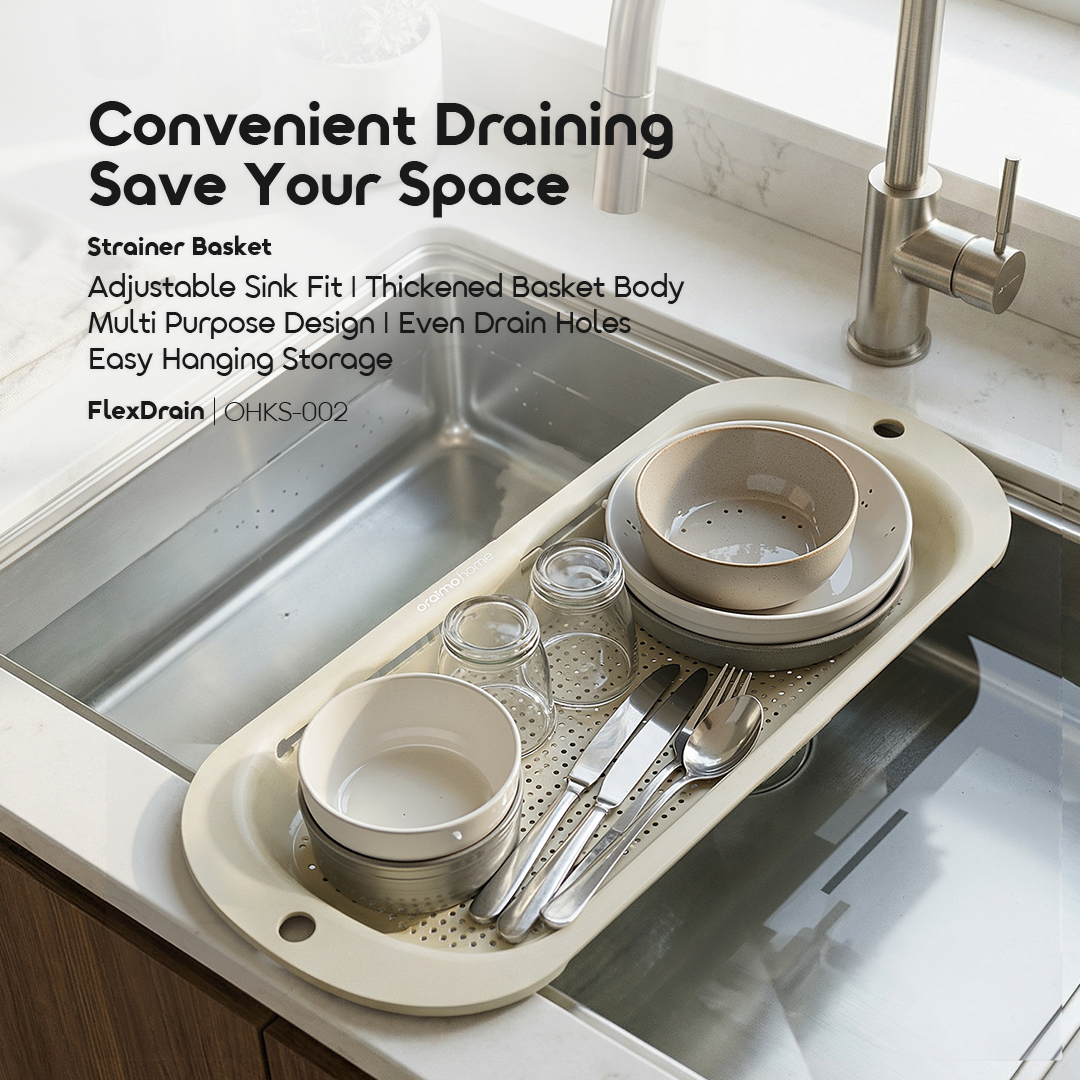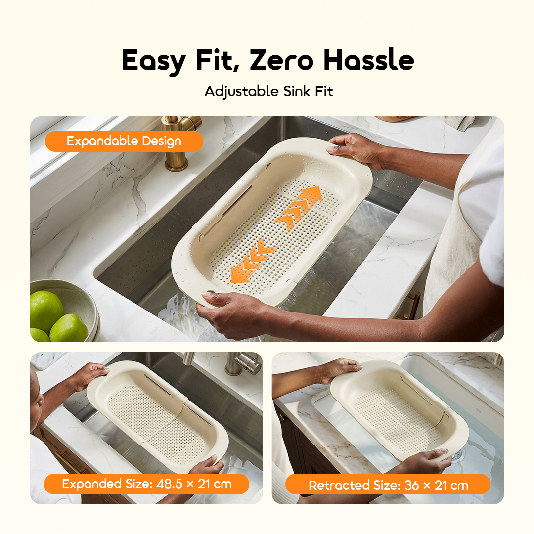 Designed to expand and fit different sink sizes, this strainer basket rests securely across the sink, freeing your hands while keeping your countertop clean and organized.